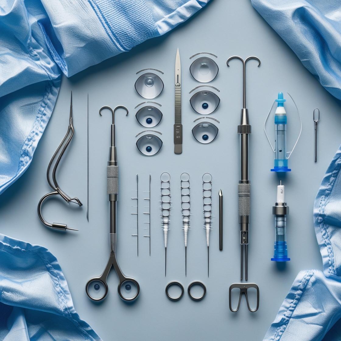 Eye drapes, microsurgical blades, eyelid speculums, 10-0 sutures, IOL injectors, disposable cannulas